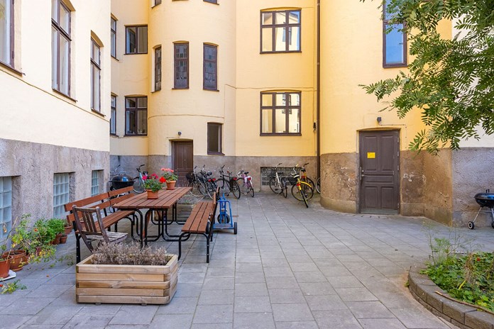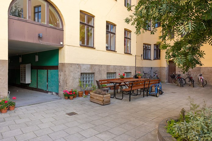 I huset finns utöver bostäder också en frisör, antik lampbutik, tatueringsstudio och kontorslokaler.