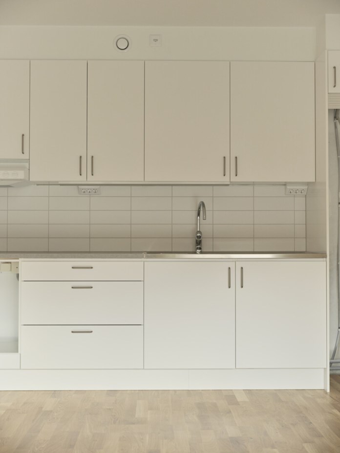 Lägenheterna har öppen planlösning, med ett genomgående 3-stavs parkettgolv i ek, Köket är utrustat med kombinerad kyl och frys i 1-2 rum och kök, respektive fristående kyl och frys i 3-4 rum och kök. Samtliga kök har god förvaring med vitmålade skåpluckor och spis med glashäll.